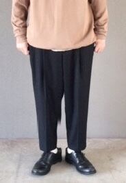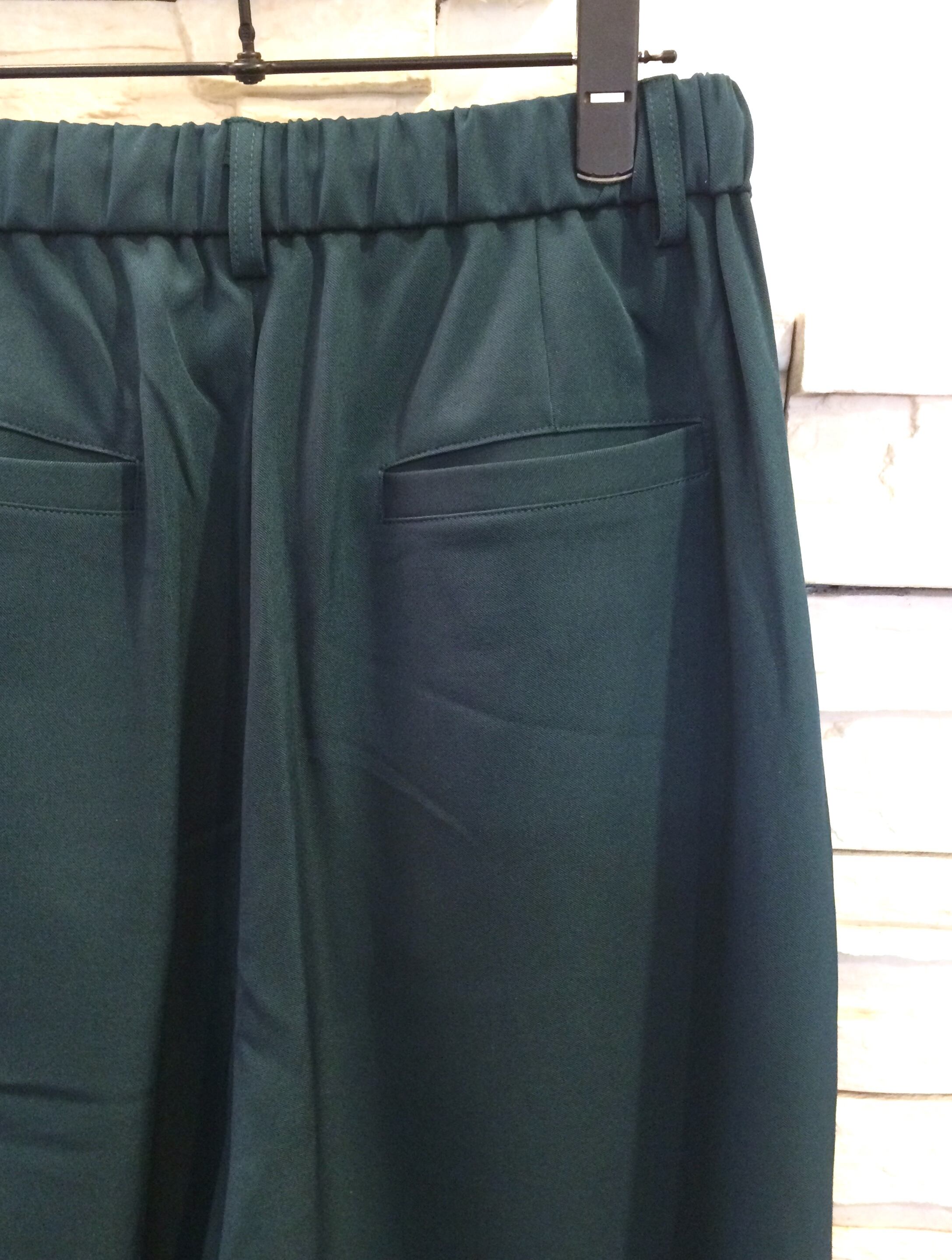 まるで繭(まゆ)の中にいるようにふんわりと包み込んでくれるそんなシルエット。真ん中あたりにふっくら丸みが付いて窮屈感を全く感じません。ポリエステル95%のテロンてした生地も「ゆるさ」の秘訣。センタープレスを付けることによってちょっとだけ綺麗めな印象に。