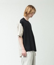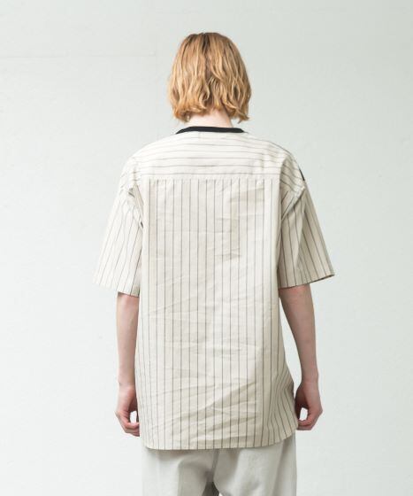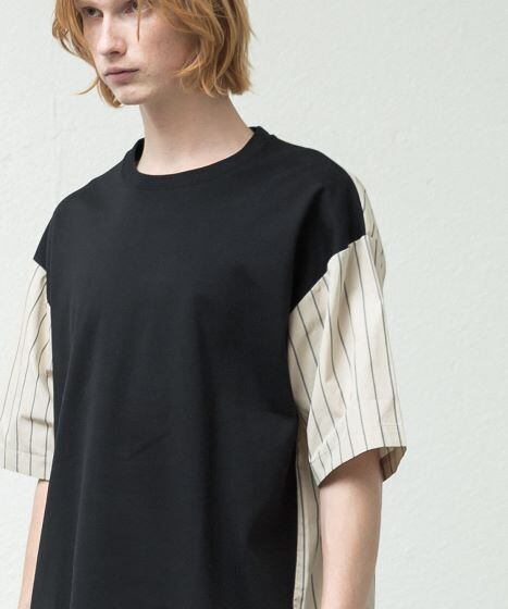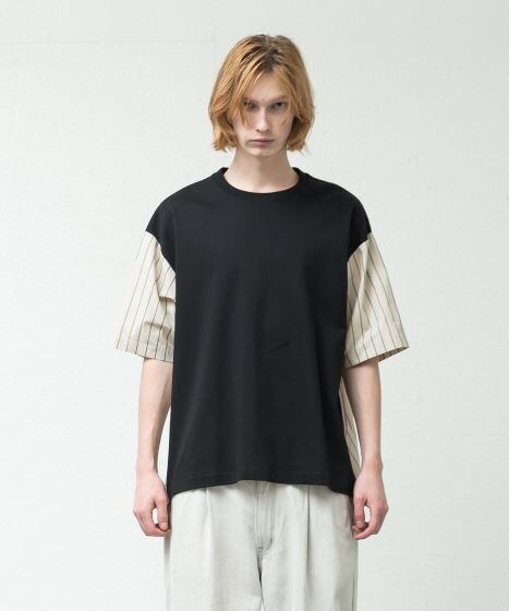 シルキータッチのポンチ生地とレトロな印象のストライプ生地をコンビネーションで合わせたTシャツ。前身頃は光沢感とハリコシのあるダブル組織のしっかりとしたジャージ素材で、袖と後ろ身頃にはストライプのシャツ地を採用。ゆったりとしたシルエットでシンプルになりがちなTシャツをシャツと融合することで一枚で差のつくアイテムに。