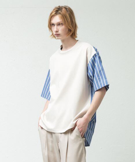 シルキータッチのポンチ生地とレトロな印象のストライプ生地をコンビネーションで合わせたTシャツ。前身頃は光沢感とハリコシのあるダブル組織のしっかりとしたジャージ素材で、袖と後ろ身頃にはストライプのシャツ地を採用。ゆったりとしたシルエットでシンプルになりがちなTシャツをシャツと融合することで一枚で差のつくアイテムに。