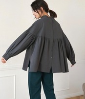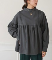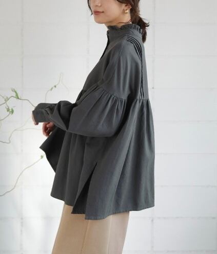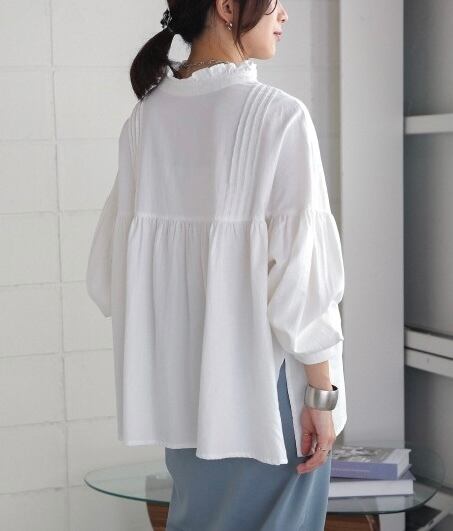 スタンドカラーの襟端にフリルをあしらったシャツ。